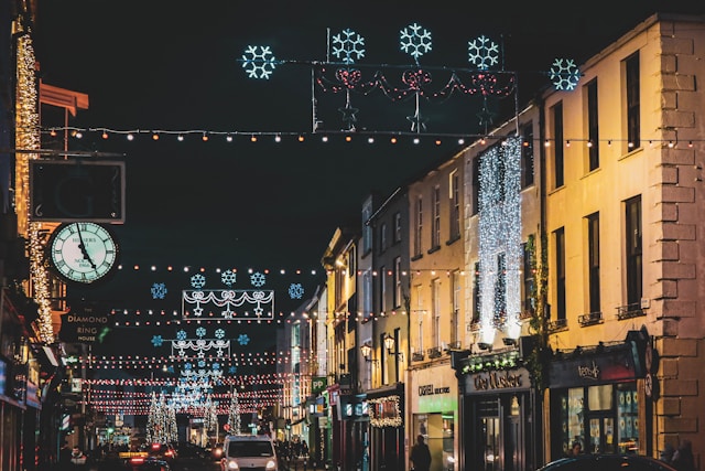 While technically a small town, Westport has a cozy village vibe perfect for Christmas. Its Georgian streets are decked out in lights, and the community spirit is palpable. Westport House often hosts a Winter Wonderland event, complete with Santa’s Grotto and festive activities for families. Enjoy a scenic walk or cycle along the Great Western Greenway, followed by a warm drink in one of the town’s many cafés.