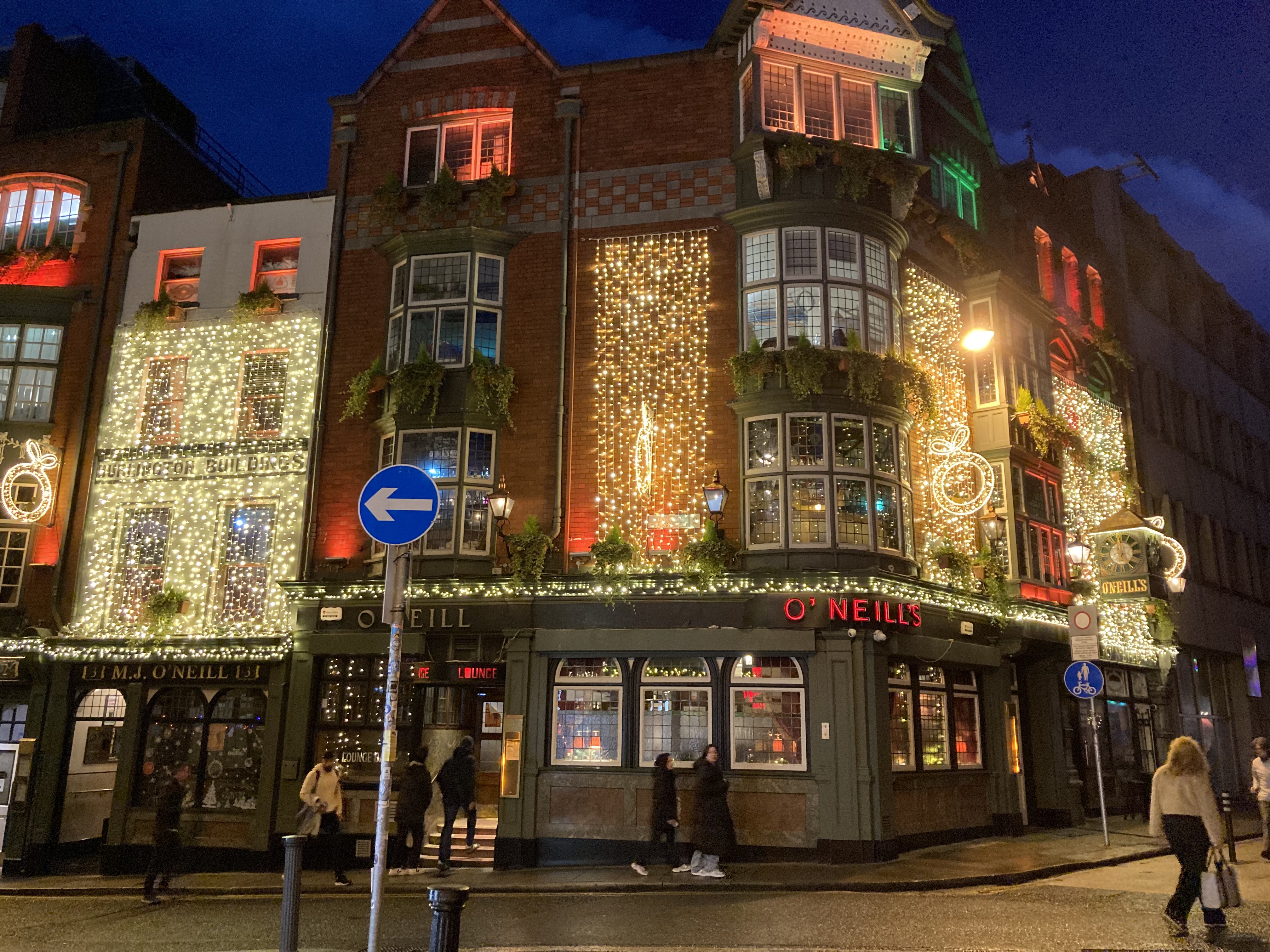 Un po’ più tradizionale ma assolutamente bello è il pub O’Neills in Suffolk Street. Qui, l’intera facciata della casa è decorata con luci natalizie bianche e calde, che completano il nome del pub in rosso.