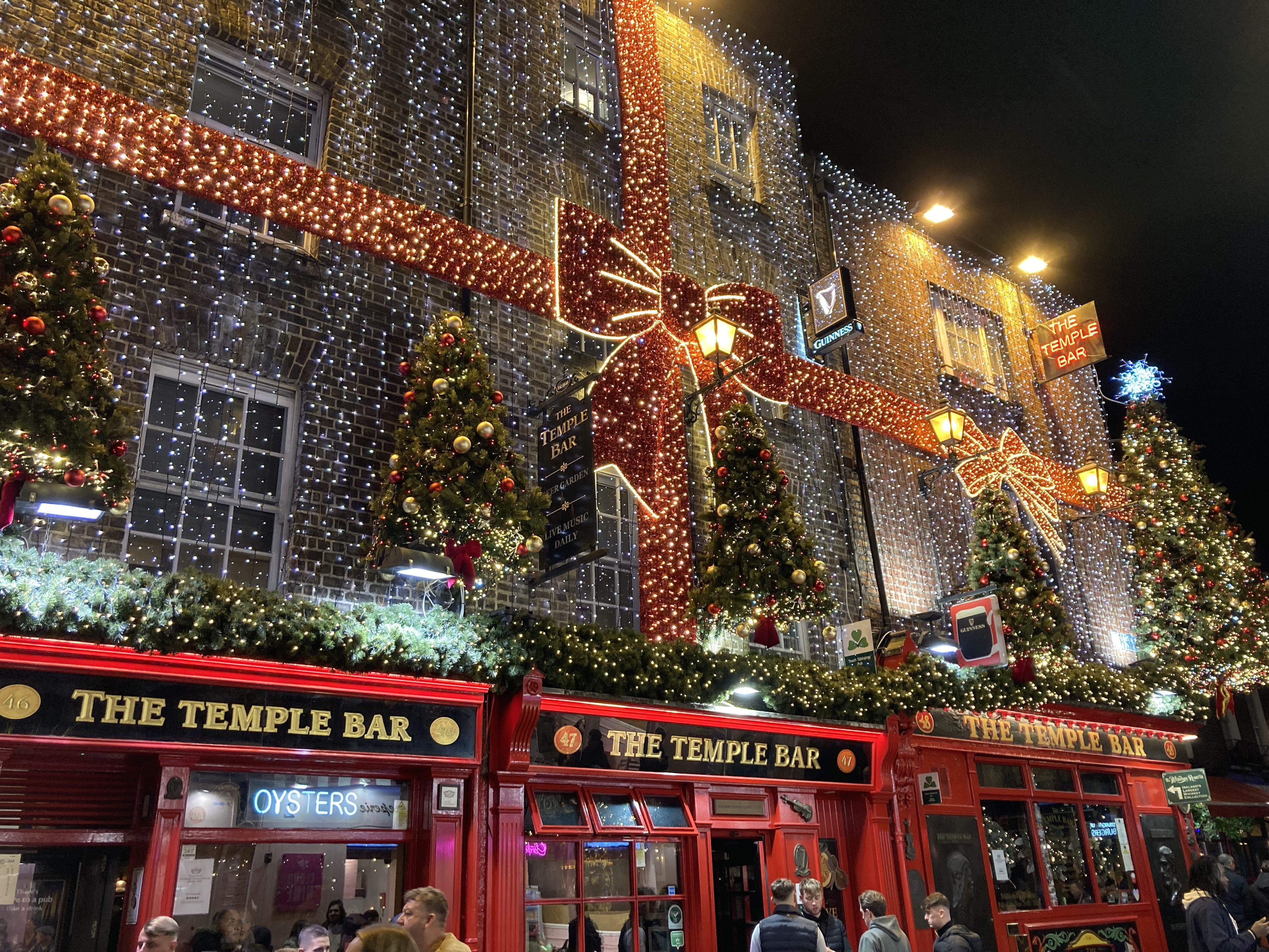 Non sono solo i negozi a decorare le loro vetrine e facciate. Anche i pub irlandesi offrono alcune delle decorazioni natalizie più stravaganti di Dublino. Innanzitutto, c’è Temple Bar: Da sempre una calamita per i turisti e sempre decorato in qualche modo, è particolarmente bello durante il periodo natalizio. Migliaia di luci adornano la facciata del pub, un enorme arco sovrasta gli spettatori e diversi alberi di Natale decorati sono allineati sulla facciata del pub. È davvero uno spettacolo bellissimo e vale sempre la pena fermarsi, anche se non hai intenzione di entrare e unirti ai tanti turisti che visitano il pub.